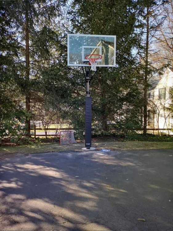 - Patented Internal Compression Height AdjustmentAllows for adjustments between 6′ and 10′Backboard Specs60″W x 38″H x 3/8″ thick, made of fully-tempered glass and backed with a 1-1/2″ structural steel H-frame for paramount stability. Acrylic backboards also available.No Dead SpotsBackboard provides for consistent rebound, even at cornersBushingsNylon bushings at pivot points for smoothness and quiet, 1/4″ thick steel bushings at rim mounting for security and strengthThoughtful DesignRounded edges and corners create a safe play area for the kids.Extension AreaWide grip, die-formed extension arms from pole to backboard are solid, not cut or welded, creating a 3′ space from backboard to pole.Pole StrengthA 5″ square, off-set, one-piece steel pole lessens shaking and vibrations. It’s made of 7-gauge steel, with 3/16″ wall thickness, superior to competing models.Long-lasting LookWith one coat of primer and two coats of a baked-on acrylic enamel, the Contender will maintain its appearance for years to come.Quality and WarrantyMade in the USA, comes complete with a 5-Year Limited Warranty (for residential use, only).List Pricelist price $2,799