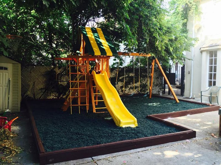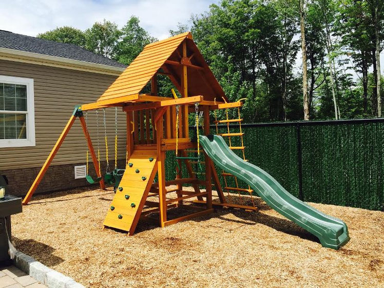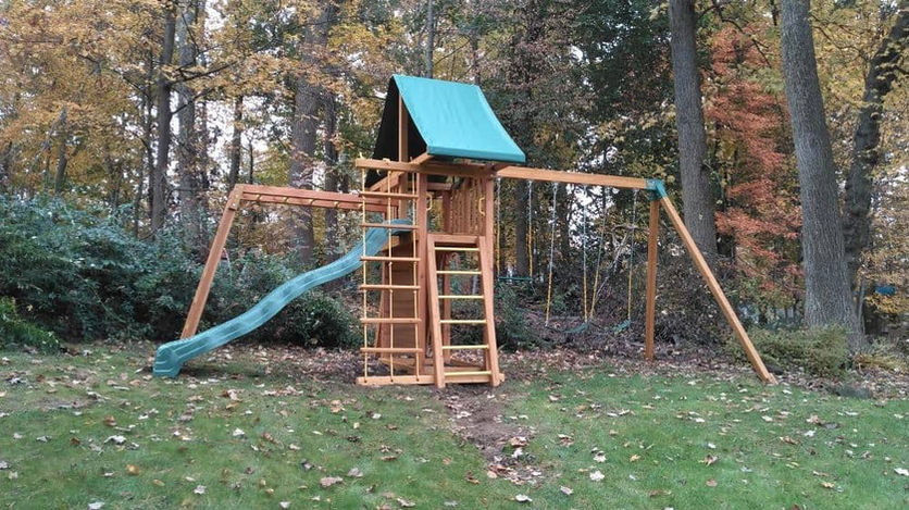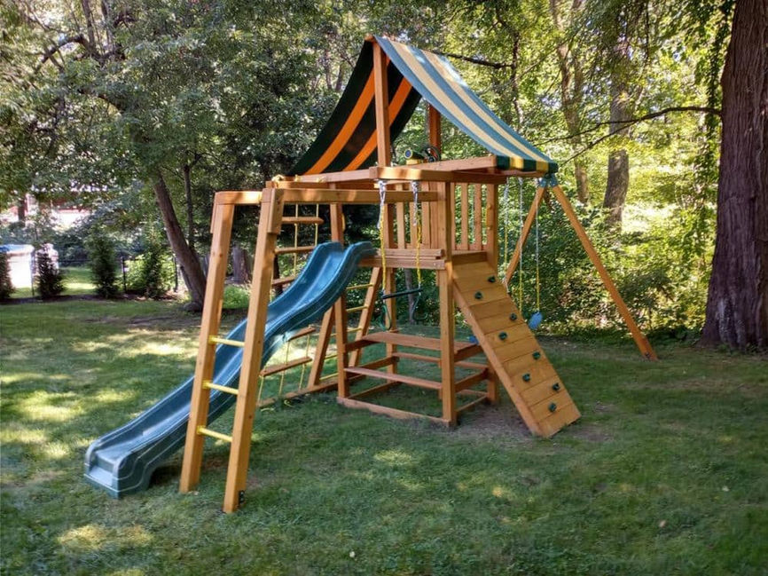 The Dreamscape Wood Swing Set will give the kids plenty to do! Its standard features include a large clubhouse complete with a steering wheel and telescope; a 10-foot wave slide; two sling swings, a gym ring/trapeze bar combo and lots more! This backyard playset also offers two ladders and a challenging rock climbing wall, so the kids can strengthen their muscles while having fun. Plus, the gorgeous solid cedar wood and bright tent top canopy make this swing set a beautiful addition to any backyard.